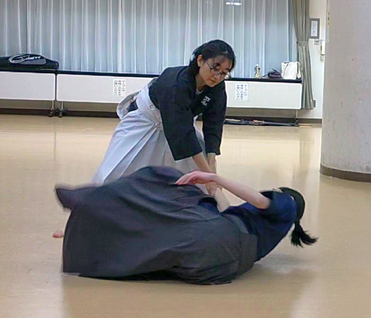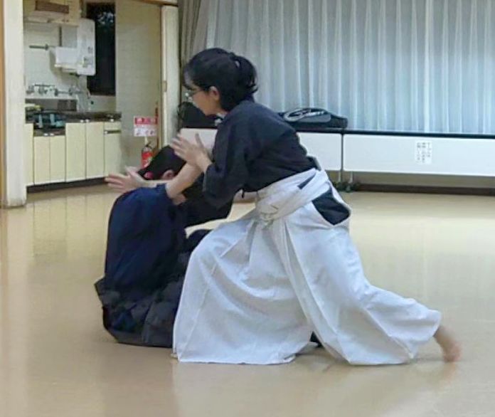 杖腕を抜いてから、片膝立てて詰めてから、の基本練習を行ってからダイレクトに崩す方法で行った。