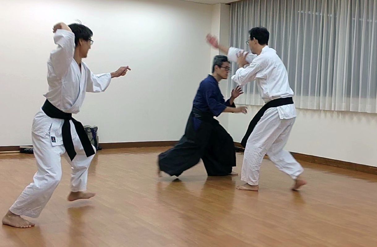 最後に小太刀で打ちかかってくる相手を素手で捌く1例として、手の甲で常に捌いていく練習。